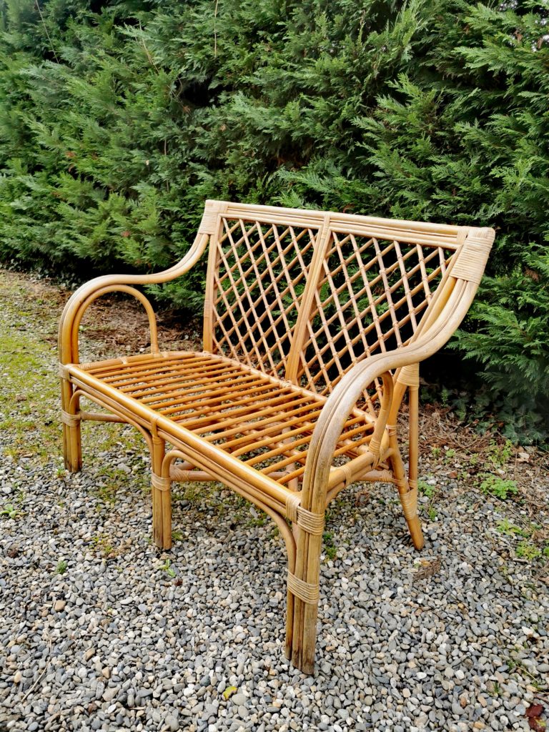 Bancs osier authentiques bancs vintage avec coussin d’assise longueur 65, largeur 110, hauteur 85 également de nombreux autres meubles chinés en osier & rotin !