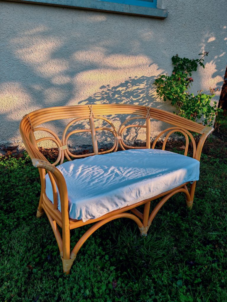 Banquette spirale banquette années 70, rotin osier courbes arrondies, dossier & accoudoirs galbés longueur 75, largeur 115, hauteur 80