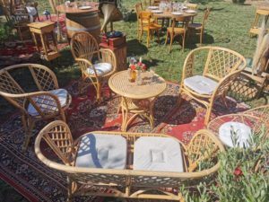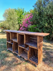 un panel de décors à thème imaginés puis créés de toutes pièces, du matériel de réception en bois fait sur-mesure, des créations artisanales, des jeux géants traditionnels uniques, de la verrerie authentique et de la vaisselle vintage raffinée.
