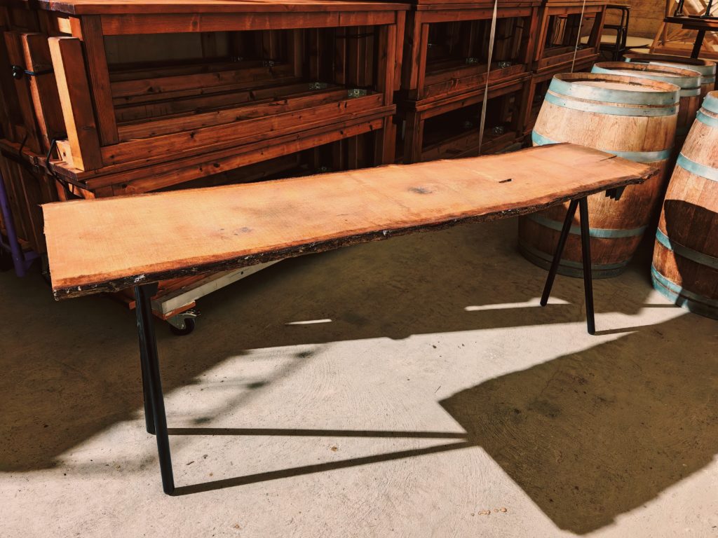 Tables buffet CRÉATION * D’échos en détours * longues tables pliantes, plateau en chêne massif vernis, piètement acier longueur 50, largeur 200, hauteur 75 5 tables disponibles