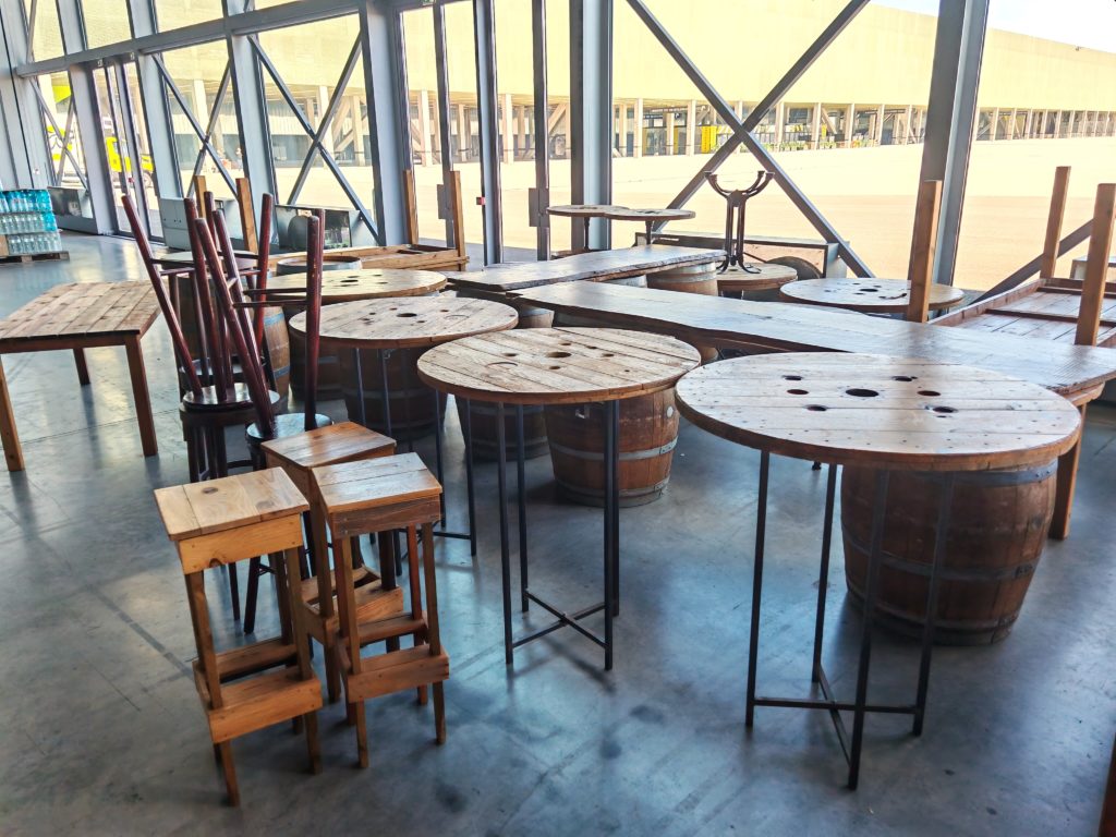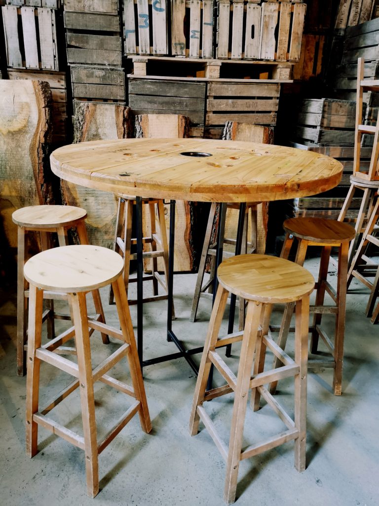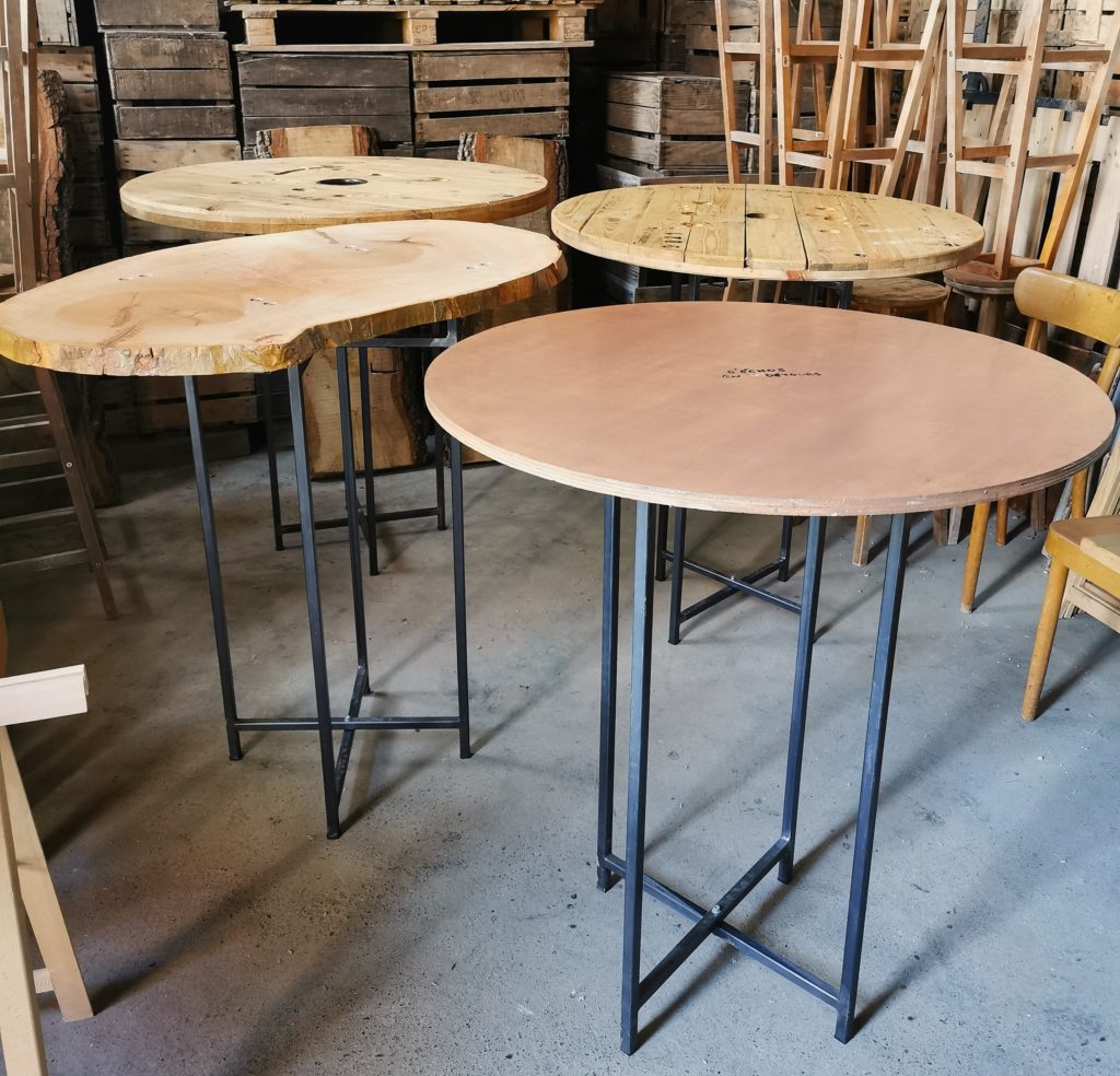 Tables cocktail tables plateaux bois (ronds tourets, ronds contreplaqué, bois massif chêne platane) pietement acier pliable hauteur 110 4 tables disponibles