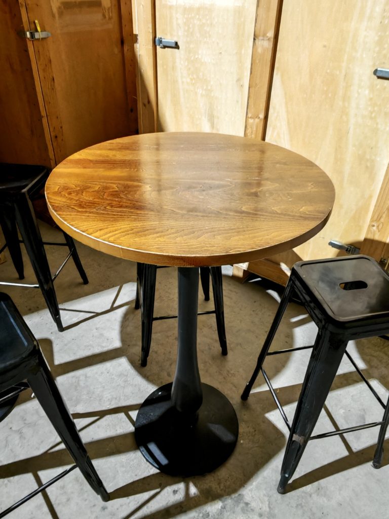 Tables hautes bistrot création upcycling, tables vintage style bistrot pied en fonte, plateau de touret vernis hauteur 115, diamètre 60 4 tables disponibles